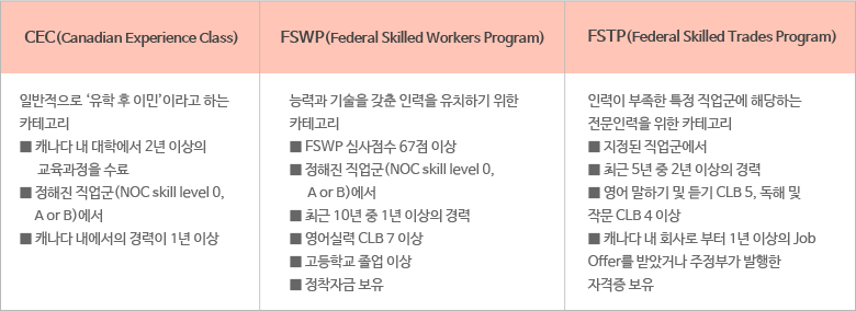 - Express Entry를 통해 캐나다 이민 신청이 가능한 경우는 아래의 3가지 카테고리에 속하는 경우입니다.