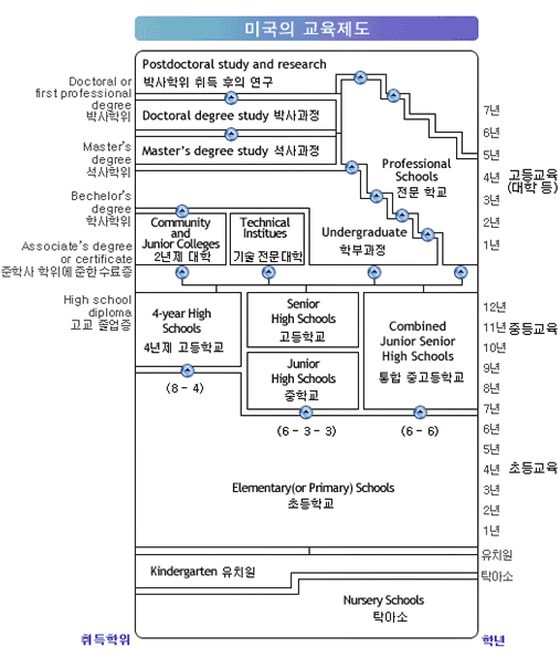 미국의 교육제도는 우리나라의 교육제도와 매우 비슷합니다 미국의 학교 제도는 공교육 중심으로 바뀌면서 주에 따라 학제의 차이를 보이고 있으며 다양한 형태로 운영되고 있습니다. 그러나 전체적으로 보면 학년 중심의 교과과정을 운영하고 있기 때문에 학생의 교육 및 학교 간의 이동이 자유롭게 이루어 질 수 있도록 되어 있어 전학 또는 진학의 혼란은 거의 없습니다.