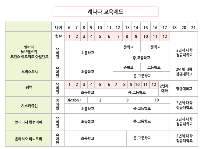 캐나다의 교육제도는 가능한 많은 사람에게 폭 넓은 교육의 기회를 제공하는 것을 목표로 합니다. 교육의 책임은 기본적으로 각 주에 있고, 진학에 관한 부분도 각 주의 교육제도에 따릅니다. 의무교육은 초등~중등 교육 까지 이며 교육과정은 유치원, 초등교육, 중등교육, 고등교육과정으로 구분됩니다.