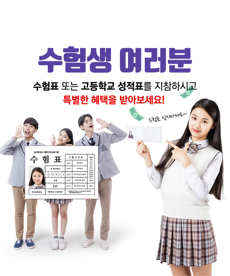 수험표 또는 성적표를 지참하시고 특별한 혜택을 받으세요