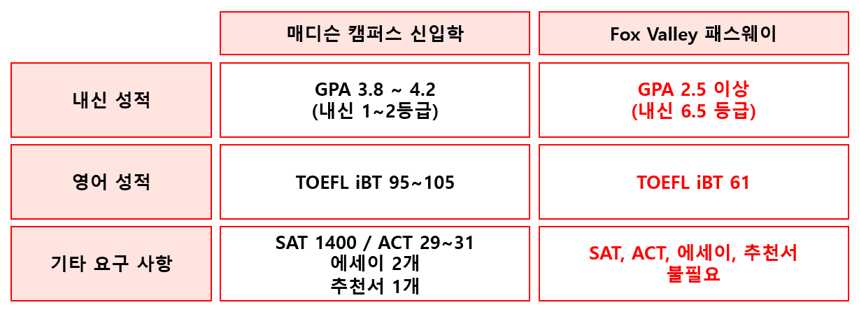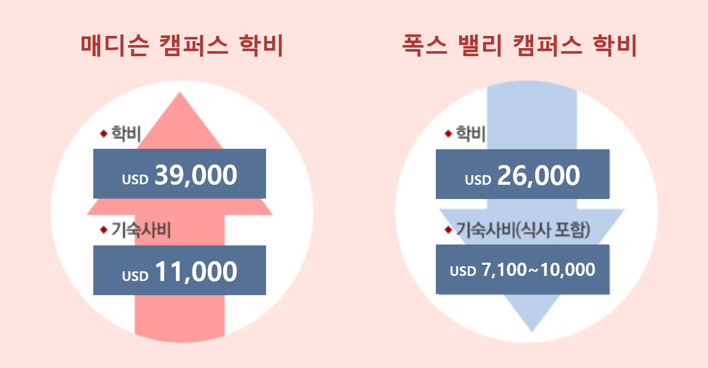 'GO: Madison' 패스웨이 프로그램은 미국과 영국에서 대학 진학 과정인 패스웨이 프로그램을 전문으로 제공하는 글로벌 교육기관 Kings Education에서 제공하는 과정으로 위스콘신 주립대 폭스 밸리 캠퍼스(University of Wisconsin Fox Valley)에서 경제적인 비용과 유리한 입학 조건으로 2년간 학업한 후 프로그램 성적이 진학 조건을 충족한다면 매디슨 캠퍼스로 진학을 100% 보장받을 수 있는 프로그램입니다. 또한, 프로그램에서 취득한 성적으로 매디슨 캠퍼스 외에도 뉴욕대학교, 보스톤 대학교, 에모리대학교 등 미국의 최상위 명문대학으로 편입 지원이 가능합니다. |