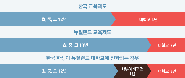 오클랜드 대학교를 포함한 뉴질랜드 대학교에 입학하기 위해서는 뉴질랜드 교육과정의 13학년을 졸업해야 합니다. 한국의 고등학교를 졸업하게 되면 초•중•고 과정을 합쳐서 총 12년이므로 학부예비과정(Foundation)이라는 추가적인 1년의 교육과정을 이수해야 합니다. 오클랜드 대학교의 경우, 학부예비과정의 성적을 통해서 대학교 입학여부가 결정됩니다.