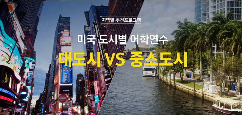 - 미국은 동부, 서부, 중부 등 지역에 따라 분위기와 특성이 다르고 대도시와 중소도시 간의 환경 차이도 큽니다. 그러므로 미국에서 성공적으로 어학연수를 마치고 돌아오려면 무엇보다 자신의 성향을 먼저 파악하고 잘 맞는 도시를 선택하는 것이 성공적인 어학연수의 첫걸음입니다. 대도시와 중소도시, 어느 한 쪽이 절대적으로 더 좋다고 말할 수 없으며 양쪽 다 각각의 장점을 갖고 있기 때문에 무엇보다도 대도시와 중소도시의 특성을 확인하여 연수 목적에 맞는 도시를 선택해야 합니다.