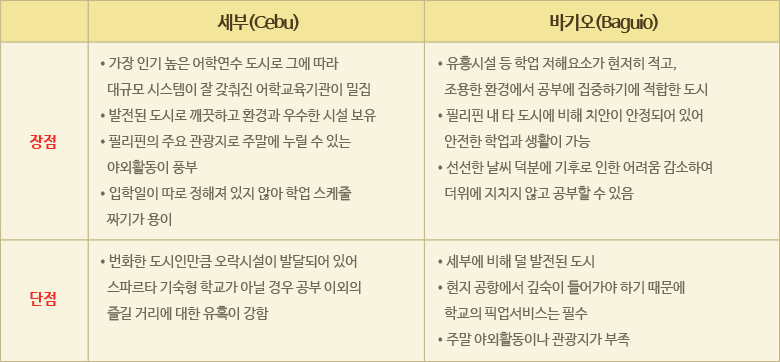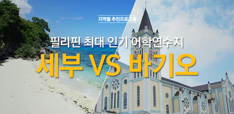 공부도 중요하지만 다양한 경험과 깨끗한 환경이 중요한 사람에겐 세부가 적합하고, 조용한 도시에서 오로지 공부에만 집중하고 싶은 사람에겐 바기오가 더 적합한 유학지가 될 것입니다.- 유학네트 추천, 세부의 영어학교