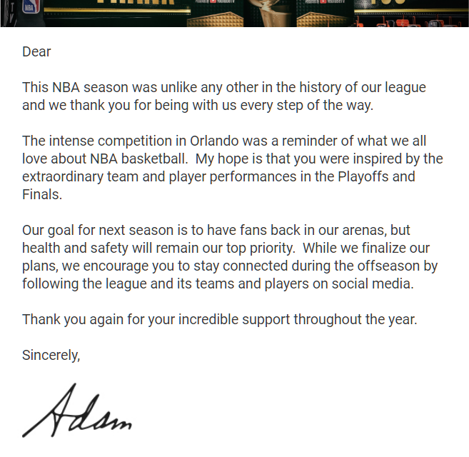 경기가 끝나고는 NBA의 위원인 Adam Silver가 NBA 팬들에게 메일을 보내기도 했습니다.
