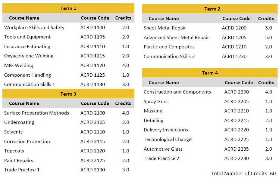 기간 : 2년 시작일 : 2016년 1월 학비 : 약 $27,990(2년) 입학요건 : IELTS 5.0 이상 또는 TOEFL 60 이상 특징 : - 자동차산업 분야에서 외형복원 전문가를 양성하도록 구성된 과정 - 화학반응 등을 통한 복원기술 습득 - 유리, 인테리어, 부품 등의 교체 및 수리기술 습득 - 과제물 경쟁을 통한 학생 수상 - 상대적으로 낮은 영어성적(IELTS5.0)으로도 입학 가능 - 졸업 후 3년간 취업비자 발급