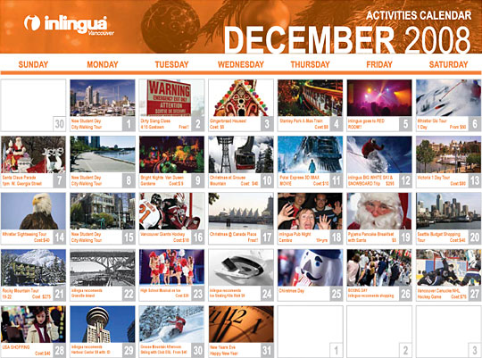 캐나다 BC주 밴쿠버에 위치한 inlingua Vancouver의 2008년 12월 특별활동 스케쥴표 안내입니다.