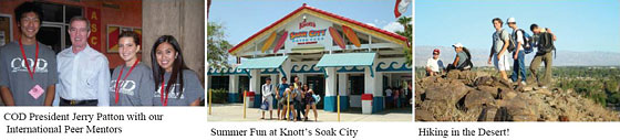 COD는 어떤 대학? 캘리포니아 주의 팜 데저트(Palm Desert)에 위치해 있는 COD는 1958년 설립된 정식으로 공인 받은 커뮤니티 컬리지입니다. 공립 2년제 대학이며, 2학기 제로 운영되고 있습니다. 총 학생 수는 10,900명으로 많은 학생들이 4년제 대학으로 편입을 목적으로 하고 있습니다. 이미 많은 학생들이 COD를 통해 UC Berkeley, UCLA, UC San Diego를 포함한 UC(캘리포니아 대학), CSU Long Beach, CSU Fullerton을 포함한 CSU(캘리포니아 주립대학), 그리고 USC와 같은 명문사립대학으로 편입하여 공부하고 있습니다. COD의 뛰어난 대학편입지원서비스와 UC, CSU를 포함한 다양한 학교와의 공식학점인정협정(Articulation Agreement)은 학생들이 보다 쉽고 확실하게 편입에 성공할 수 있는 원동력이 되어 주고 있습니다. 세계적으로 유명한 휴양도시인 캘리포니아 주 팜 스프링스 지역에 위치한 COD는 학생들이 다양한 여가생활을 즐기며 공부하는데 최고의 장소입니다. 로스앤젤레스, 샌디에이고, 디즈니랜드 및 아름다운 캘리포니아 해변까지 차로 잠깐이면 도착할 수 있는 거리에 있습니다. 인기전공으로는 보건전문학, 경영학, 시각행위예술이 있습니다.