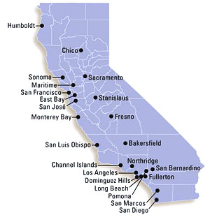 * CSU 23개 캠퍼스 CSU Bakersfield, CSU Channel Islands, CSU Chino, CSU Dominguez Hills, CSU East Bay, CSU Fresno, CSU Fullerton, Hamboldt State University, CSU Long Beach, CSU Los Angeles, California Maritime Academy, CSU Monterey Bay, CSU Northridge, CSU Pomona, CSU Sacramento, CSU San Bernardino, San Diego State University, San Francisco State University, San Jose State University, California Polytechnic State University, CSU San Marcos, Sonoma State University, CSU Stanislaus CSU는 “저렴한 학비로 최고의 교육 제공을 제공한다.”를 모토로 운영되고 있으며 23개 캠퍼스를 가지고 있습니다. 주로 캘리포니아 주민들에게 입학우선권을 제공하며 타주에서 지원하는 경우 입학조건이 더 어렵습니다. 예를 들어 캘리포니아 주민의 지원자격은 2.0이지만 타주 지원자는 2.5로 상향조정 되어 있습니다.
