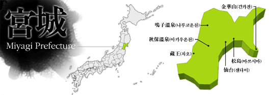 미야기현은, 태평양에 면한 일본 북동부에 위치한다. 현청소재지인 "센다이 시"를 중심으로 남쪽으로는 "아부쿠마 강", 동쪽으로는 "기타카미 강"이 흐르고 있다. 바다쪽으로는 북부의 복잡한 해안과 "마쓰시마" 남쪽의 완만한 경사의 모래사장이 펼쳐져 있으며, 서쪽의 내륙부에는 "자오산"을 비롯한 1천 미터 급의 산들이 즐비하다. 이러한 지리적인 특징을 지닌 "미야기"는 일본의 3대 절경의 하나로 알려진 마쓰시마와 풍부한 자연의 혜택을 입은 "자오산, 리쿠추해안으로 연결되는 "미나미산리쿠킨카 산 국정공원"의 리아스식 해안이 매력적이다. 미야기 현 중부에 위치한 센다이 시는 17세기 초에 이 지역을 통치했던 다테 마사무네가 '아오바 성'을 축성한 이래 다테 가문의 성곽도시로 번영해 온 도호쿠 지방 최대의 도시이다.