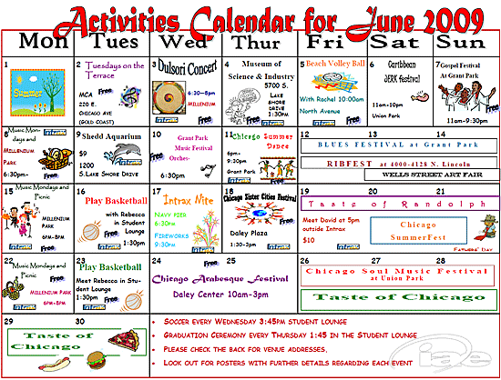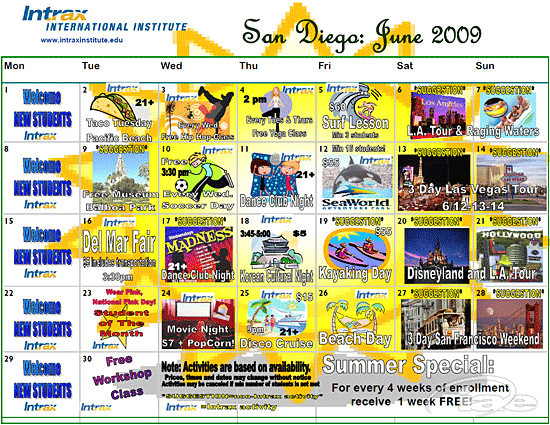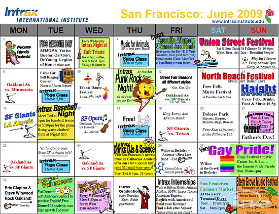 미국 샌프란시스코, 샌디에이고, 시카고 및 캐나다 밴쿠버에 센터를 운영하고 있는 Intrax International Institute, 미국 센터들의 6월 특별활동 캘린더를 확인해볼까요? 매월 초 각 센터에서는 학생들을 위한 특별활동을 한 눈에 확인할 수 있는 특별활동 캘린더를 제작하며, 학교 게시판 또는 Intrax 웹사이트에서 본 특별활동 캘린더를 확인하실 수 있도록 하고 있습니다. 특히 이번 6월에는 많은 야외 활동과 함께 다양한 축제가 마련되어 있으며, 각 도시 별로 아래와 같은 주요 행사도 포함되어 있답니다. ☆ 샌프란시스코 : North Beach Festival (http://www.sfnorthbeach.org/) ☆ 샌디에이고 : Del Mar Fair (http://www.sdfair.com/) ☆ 시카고 : Taste of Chicago (http://www.tasteofchicago.us/)