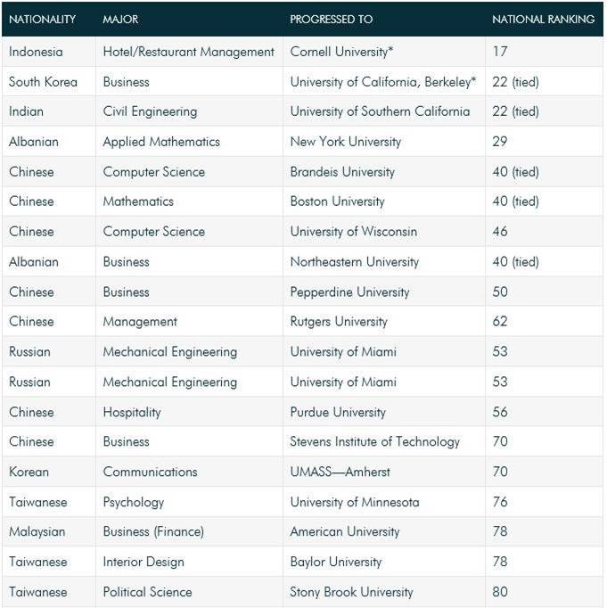 최근 ONCAMPUS 보스톤 센터에서 파운데이션 과정을 수강한 Aditya는 인도네시아 학생으로 고등학교 내신을 극복하고 미국 내 최고 명문 대학교 중 한 곳인 코넬대학교(Cornell University) 편입에 성공하였으며, Aditya뿐만 아니라 많은 학생들이 ONCAMPUS 보스톤에서 학업 후 UC버클리, 뉴욕주립대 등 미국 명문 대학교로의 편입에 성공하였습니다.
