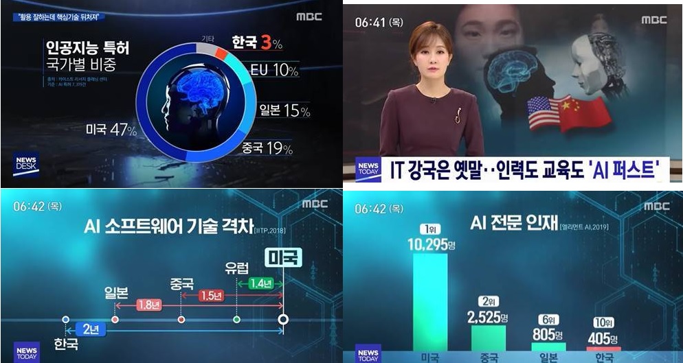 한국은 IT 강국으로 불리지만 인공지능 관련 특허, 인공지능에 필수 요소인 칩, 알고리즘 기술력은 부족하여 해외 업체에 의존하고 있어 AI 분야에서는 많이 뒤처져 있는 것이 사실입니다.