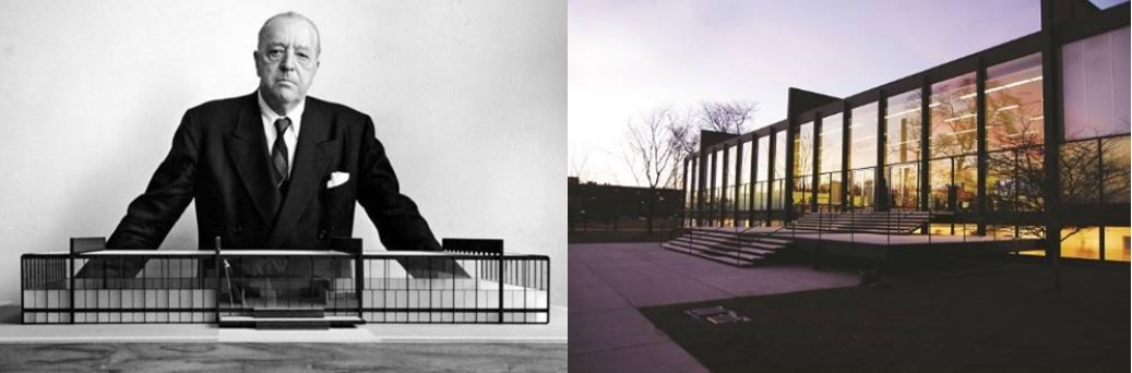 대표 건축 작품: 바르셀로나 파빌리온, 일리노이 공대 크라운 홀, 베를린 국립미술관, 시카고의 레이크쇼어드라이브 아파트, 뉴욕의 시그램 빌딩 등