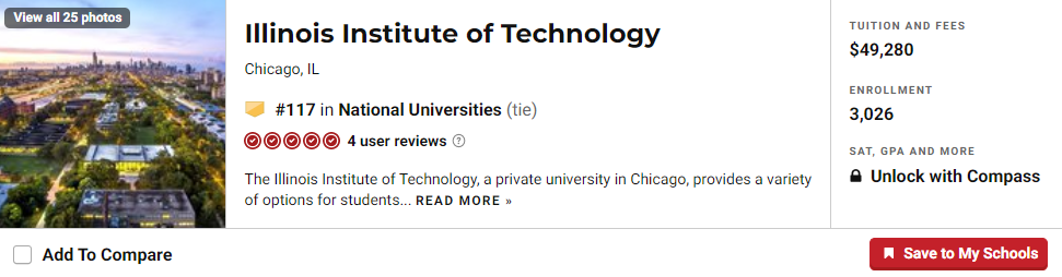 국내에서도 잘 알려진 일리노이 공과대학교 (Illinois Institute of Technology, IIT)는 미국 내에서도 손꼽히는 공과대학으로 2020년 US News & World Reports에서 미국 내 대학 순위 117위에 선정된 명문 대학교입니다. 미국 내 전문대를 포함하여 약 4,500여개의 대학이 있는 것을 감안하면 매우 높은 수준임을 알 수 있는데요, 특히 건축학 분야에서는 2020 Nich University Ranking에서 미국 내 23위, Design Intelligence에서 미국 내 Top 15에 선정되는 등 강세를 보이고 있습니다.