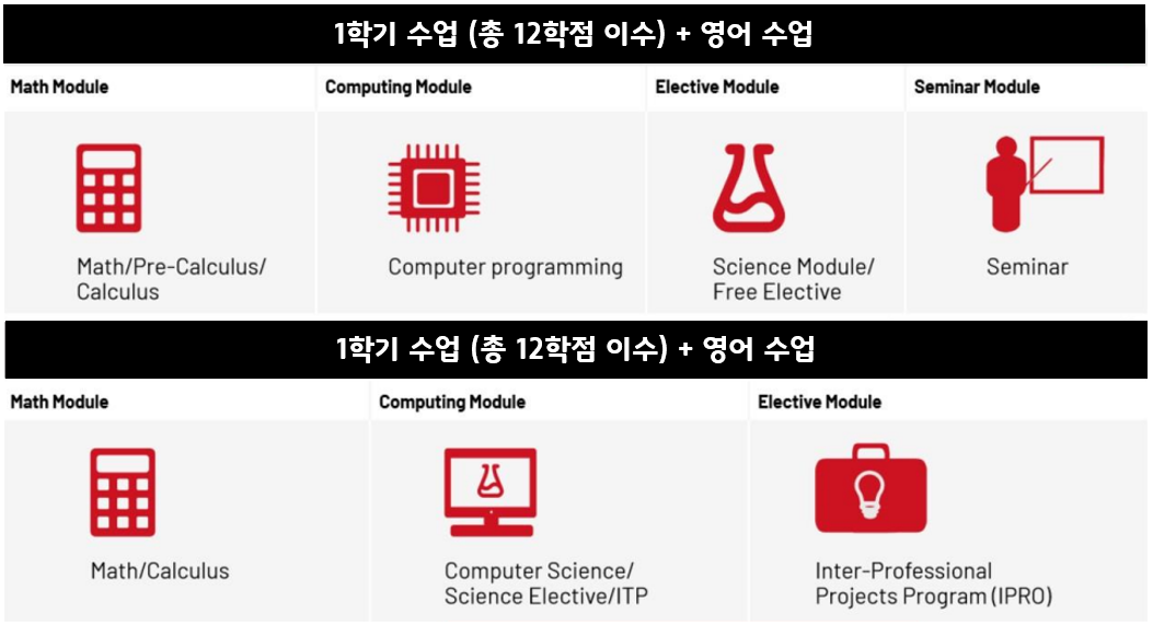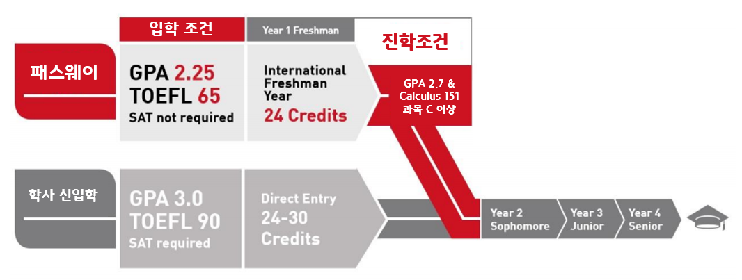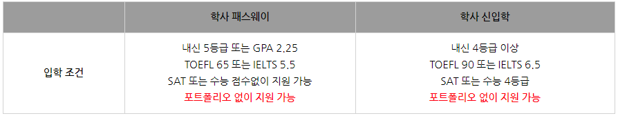 높은 수준의 교육은 물론 높은 취업률을 자랑하는 IIT의 명성만큼 유학생들이 신입생으로 입학하기 위해서는 높은 입학조건이 요구됩니다. 하지만, 학사 패스웨이를 통해서라면 신입학 조건에 미치지 못하더라도 IIT로 진학이 가능합니다. 하단의 입학 조건표에서 볼 수 있듯이 내신 5등급이여도 지원이 가능하며, 특히 건축학 학사의 경우 포트폴리오 없이 지원이 가능하기 때문에 입학 조건 충족에 대하여 고민하는 학생들에게 적합한 과정입니다.