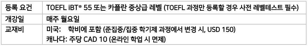미국, 캐나다, 영국, 아일랜드, 호주, 뉴질랜드 등에서 센터를 운영하고 있는 카플란의 미국과 캐나다 센터에서 제공하는 교육과정으로 TOEFL 시험 고득점을 위한 영역별 학습 및 전략 습득뿐만 아니라, 해외 대학 수업에서 요구되는 아카데믹 영어까지 전반적인 영어실력을 향상할 수 있는 커리큘럼으로 구성되어 북미권 대학 진학을 준비하는 학생들에게 최적화되어 있습니다.