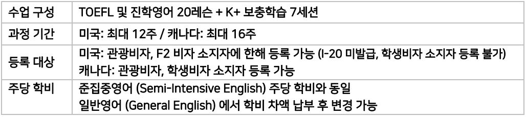 특히 TOEFL 파트타임 과정은 미국 관광비자로 학업이 가능하여 단기간 미국 어학연수를 희망하는 학생들에게도 수준 높은 아카데믹 영어를 배울 수 있는 기회를 제공하며, 온라인으로도 학업이 가능하여 코로나19로 인해 출국 일정을 연기한 학생들도 안정적으로 북미권 대학으로의 진학을 준비할 수 있습니다.