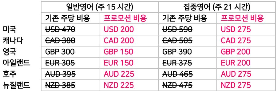북미권 대학 진학을 위해 영어연수를 계획하고 있는 학생 혹은 미국/캐나다/영국/아일랜드/호주/뉴질랜드로의 어학연수를 계획하고 있는 학생이라면 이 기회를 절대 놓치지 말고 꼭 잡으시길 추천드립니다!