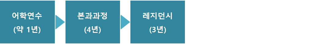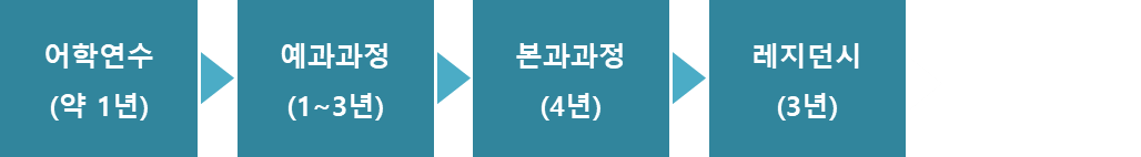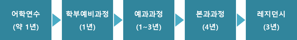 | * 어학연수 기간은 학생의 영어실력에 따라 다름 * 입학에 필요한 학점이 부족한 경우 본과 예비과정(1~2학기)을 거쳐 본과 입학 | ||