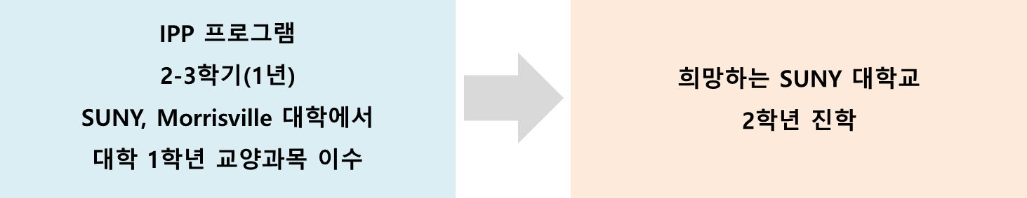 내신 6등급, TOEFL iBT 45 이상이면 IPP 입학 (영어 점수가 부족하면 어학프로그램 수료 후 입학) IPP 과정에서 취득한 학점(24-38) 100% 인정받고 SUNY 2학년으로 진학 IPP 성적을 바탕으로 진학 대학 및 학과 결정 전담 부서의 체계적 유학생 지원 시스템 입학, 학업/성적 관리, 전공 선택, 인턴십 등 종합적 학생 지원 95%의 학생들이 원하는 대학으로 진학 성공