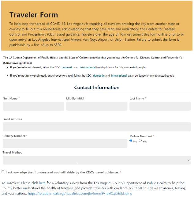 ■ 온라인 LA Travel Health Form 링크: https://travel.lacity.org/