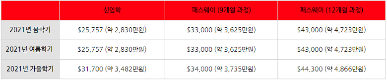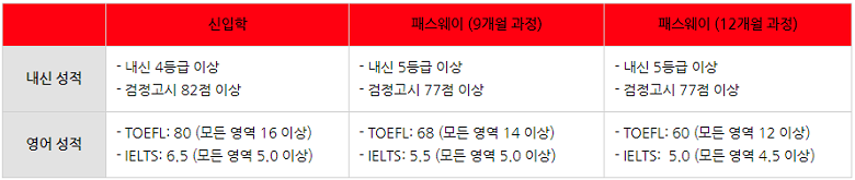 ※대학교 재학중이며, 미국 내 24학점 이내로 이수했을 경우 패스웨이 입학 가능