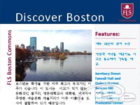 보스톤 커먼 센터에서 제공하는 보스톤 투어(Discover Boston)는 역사적인 프리덤 트레일(Freedom Trail)을 따라 걸으며 가장 아름다운 동부 미국문화를 체험할 수 있는 최고의 투어 프로그램입니다. 보스턴은 다른 도시들과 비교되지 않은 문화적인 볼거리, 명문대학교와 대학원, 세계적으로 유명한 예술문화와 먹을 거리가 있는 아름다운 도시입니다. 세계 최고의 하버드 대학을 방문하면서 미래의 학업계획에 대한 마음의 다짐도 새로이 하고 뉴 버리(Newbury)에서 쇼핑도 즐길 수 있습니다. 1시간 이내의 거리에 바닷가와 시골풍경을 즐길 수 있어 보스톤 도시 한 중심에 있는 학원에서 영어수업을 받으며 평생 못잊을 친절한 홈스테이 가족을 만나게 되는 기회를 얻을 수 있습니다.