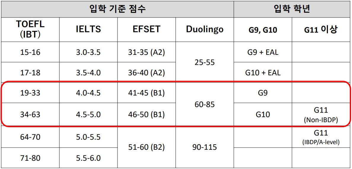 10-11학년은 IELTS 4.5-5.0 또는 TOEFL iBT 34-63 수준이면 입학할 수 있습니다.