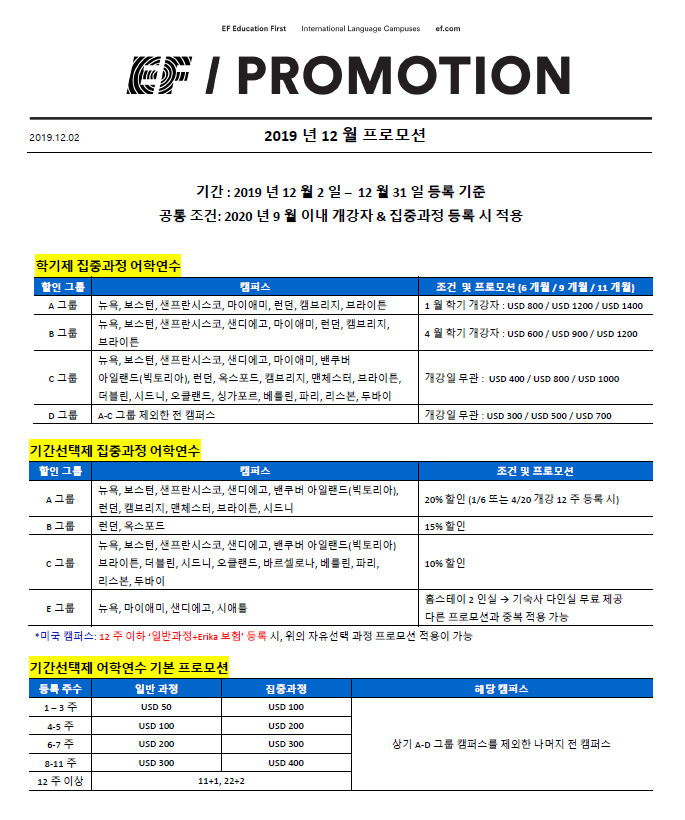 다국적 어학교 EF의 12월 장학혜택 입니다.