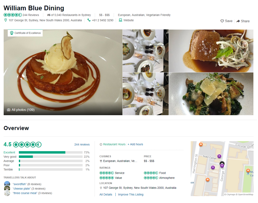 호주의 명문 요리학교인 윌리엄블루 대학 (William Blue College of Hospitality Management)에서 운영하는 윌리엄 블루 다이닝 (William Blue Dining)이 세계적으로 유명한 여행 웹사이트인 Trip Advisor에서 2018년 시드니 최고의 레스토랑 6위에 선정되었습니다.