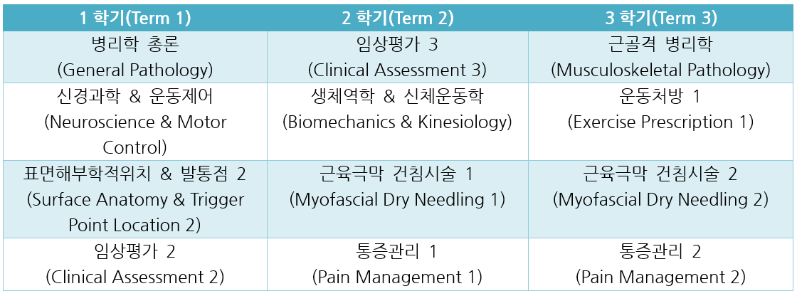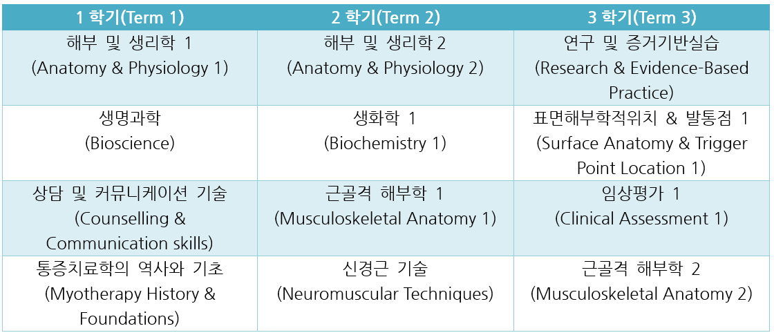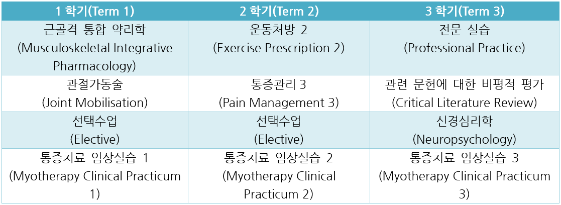 임상 통증 치료학은 근육과 뼈의 통증을 평가, 치료, 관리하는 방법을 배우는 학문입니다. 본 과정에서는 기본적인 임상 통증 관련 관련 이론을 학습하며, 실제 고객들을 대상으로 진료부터 치료까지 해결하는 학교 내 자체 클리닉인 "Think Wellbeing Centre"에서 실습을 진행합니다. 또한, 임상 통증 치료학 학사과정은 다양한 협회에서 공인을 받는 과정으로 졸업 후 협회에 등록이 가능합니다.