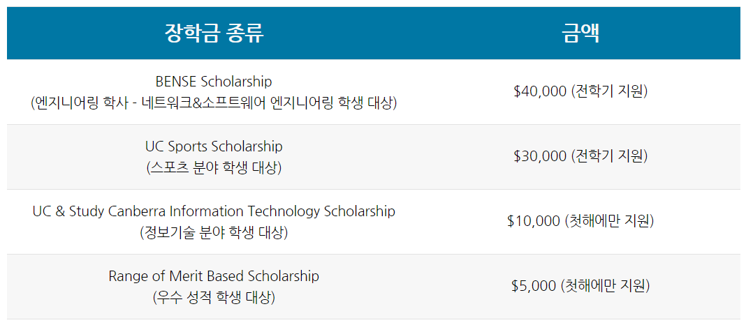 캔버라 대학은 학생들의 재정적인 부담을 덜어주기 위해 성적에 따라 제공되는 기본적인 장학금 외에도 전공에 따라 $10,000 ~ $40,000까지 장학금을 지원하고 있습니다.
