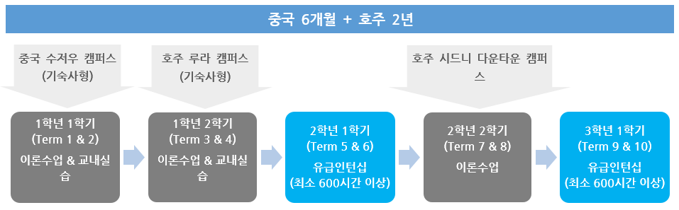 중국 수저우 캠퍼스에서는 국제 호텔&리조트 경영학 학사학위 취득이 불가능하기 때문에, 학사학위를 목표로하는 학생들은 2개국 유학 플랜 [중국 수저우 + 호주 시드니]를 통해서만 학사학위 취득이 가능합니다.