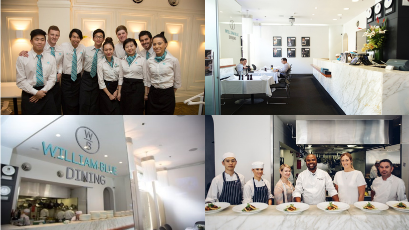 호주 시드니 다운타운에 위치한 윌리엄블루의 학생들은 학교에서 자체적으로 운영하는 고급 레스토랑인 윌리엄블루 다이닝(William Blue Dining)에서 1학년때부터 실습을 시작하여 실무중심의 교육을 받게됩니다. 세계적으로 유명한 여행 웹사이트인 Trip Advisor에서 선정한 2018년 시드니 최고의 레스토랑 순위에서 5천개 이상의 시드니 레스토랑들을 제치고 당당히 6위에 랭크될 정도로 높은 퀄리티와 서비스를 제공하는 윌리엄블루 다이닝에서 실제 고객들을 대상으로 실력을 쌓을 수 있는 윌리엄블루 학생들은 업계 내에서도 실력을 인정받아 90% 이상의 취업률을 자랑하고 있습니다.