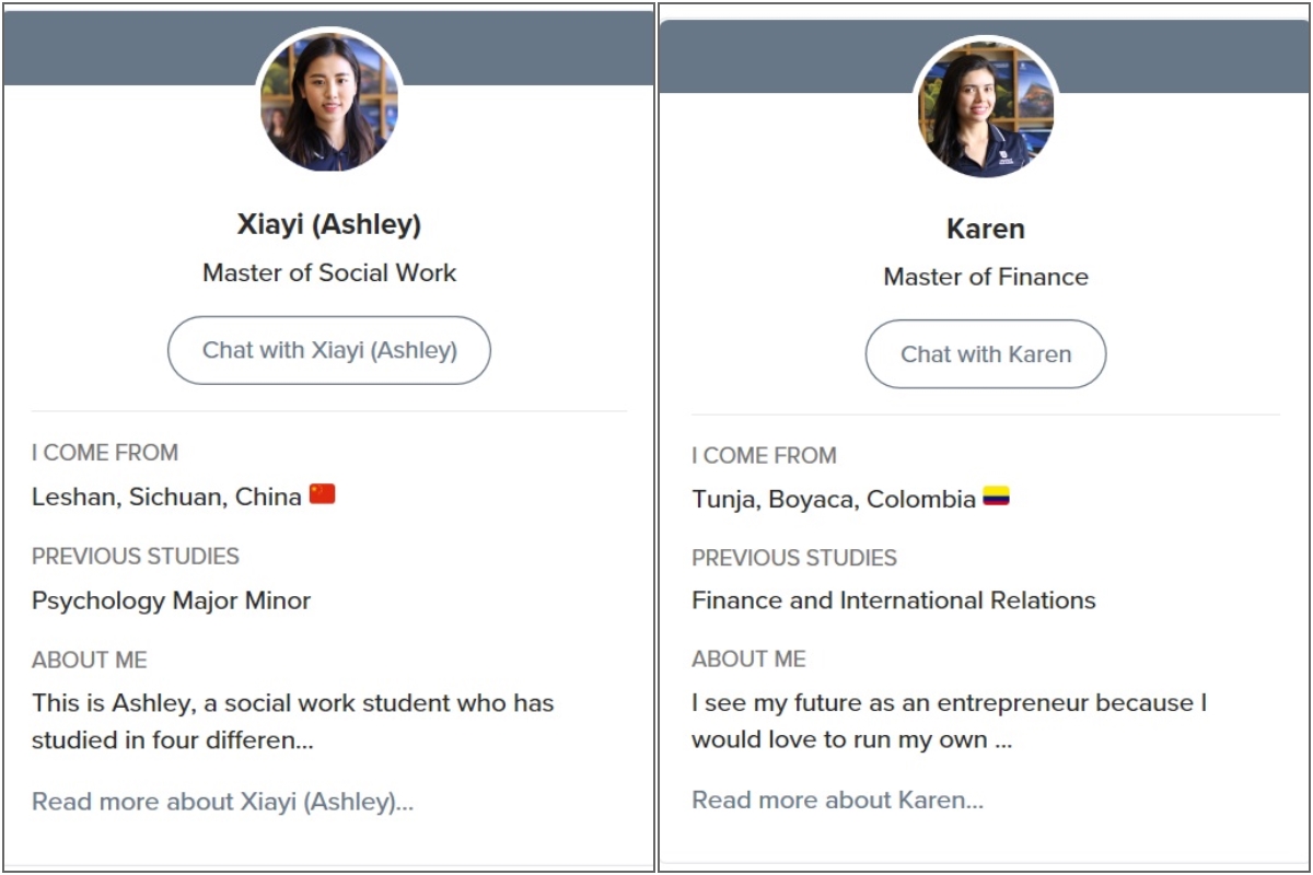 학생들은 여러가지 언어로 대화를 나눌 수 있으며 다양한 프로그램과 국적별로 분류된 재학생 리스트 중에서 조언을 얻고 싶은 상대를 선택할 수 있습니다.