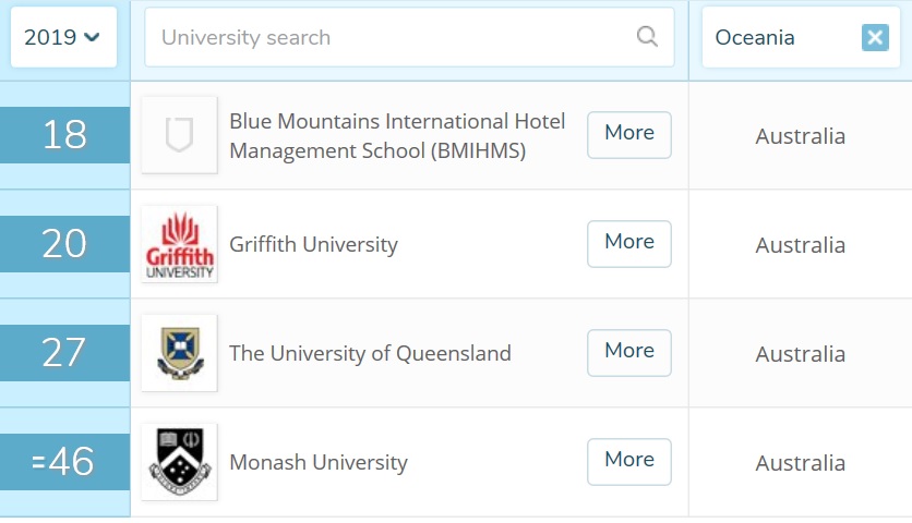 업계 평판 72.5점(호주 1위, 세계 10위), 아카데믹 평판 62.4점(호주 3위, 세계 37위)을 받아 총점 64.3으로 이와 같은 우수한 결과를 거두었으며 또다른 호텔경영학 명문 그리피스 대학교(Griffith University)는 20위를 차지하였습니다.