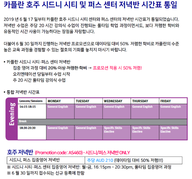 Kaplan 호주 시드니 시티 및 퍼스 센터 오후반 시간표 통일 안내 드립니다.