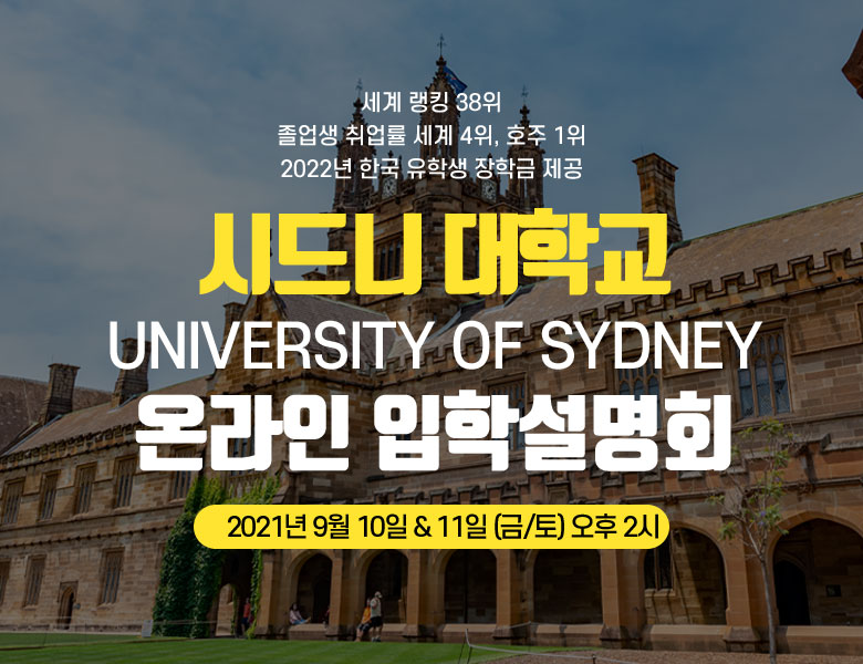 호주 No 1. 시드니 대학교의 모든 것 9월 10일 & 11일 오후 2시 온라인 입학설명회에서 안내 드립니다. 쉽지 않은 이번 기회, 꼭! 잡으세요.