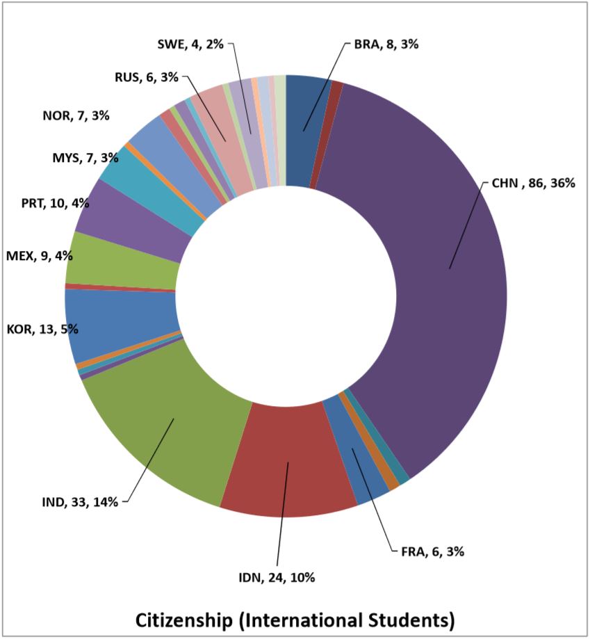 총 239명의 유학생중 국적비율을 살펴보면 현재 유학생 주요 5개 국가는