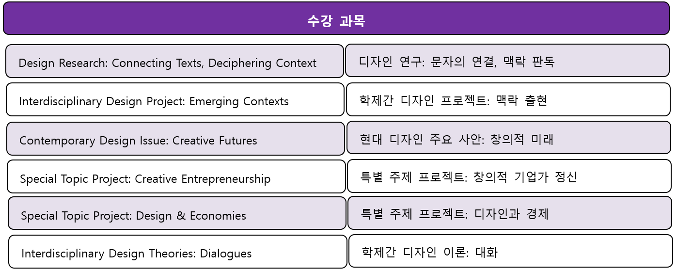30주로 구성된 디자인 석사 과정은 자신만의 아이디어와 최신 기술력을 접목시켜 한층 높은 결과물을 창출할 수 있도록 교육 과정을 제공합니다. 미디어 디자인 스쿨의 디자인 석사 과정은 전통적인 디자인 학위와는 다르게 디자인 업계에서 인정받는 교수진들로부터 일대일 멘토링을 제공하여 학생들 개개인의 특색과 아이디어를 프로젝트에 녹여낼 수 있도록 맞춤 교육을 제공합니다. 교육과정에 대한 졸업생의 만족도는 90% 이상이였으며, 수 많은 졸업생들이 미디어 디자인 스쿨의 디자인 석사 과정을 통해 자신의 커리어에서 성공적인 길을 걷고 있습니다.