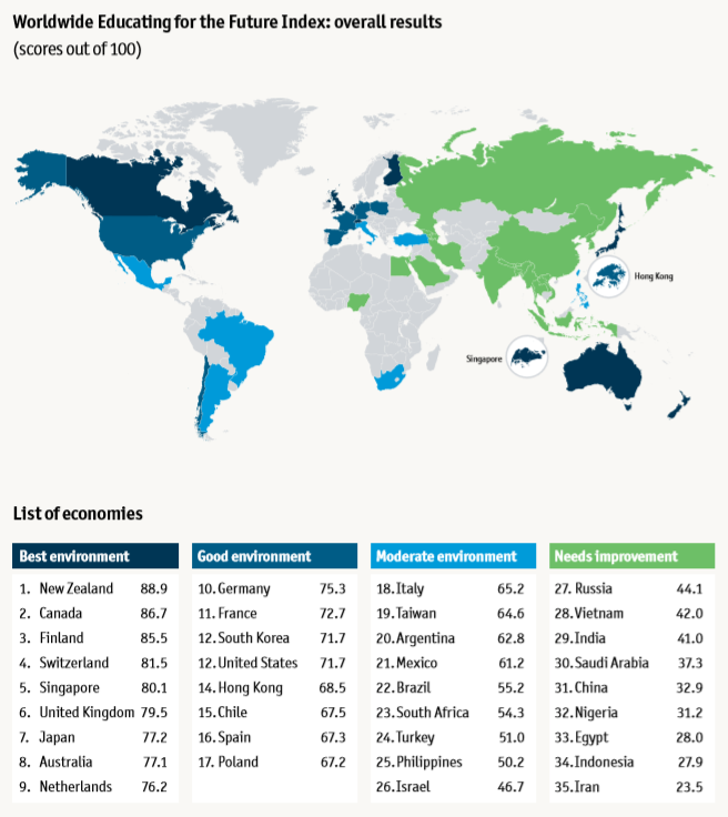 뉴질랜드가 작년 영국 이코노미스트지에서 조사한 "세계 교육 대비 지수(World Educating for the Future Index 2017”에서 미래를 대비한 교육을 잘하는 나라 1위에 선정되었습니다. 주요 평가 항목인 교육에 대한 정부의 지출규모, 교사의 수준 및 포용성과 다양성에서 높은 점수를 받았으며, 조사를 통해 높은 수준의 교수진과 미래 기술 중심의 커리큘럼을 제공한다는 것을 인정받았습니다. 최고의 교육환경을 통해 4차 산업 혁명 시대에 적합한 인재를 육성할 수 있는 뉴질랜드에서 학업을 시작해보세요!