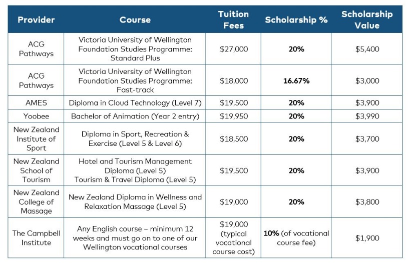 ACG에서는 웰링턴 캠퍼스 프로모션을 위해 2019년 7월부터 12월 사이에 입학하는 학생들을 대상으로 다음과 같은 장학금을 제공합니다.