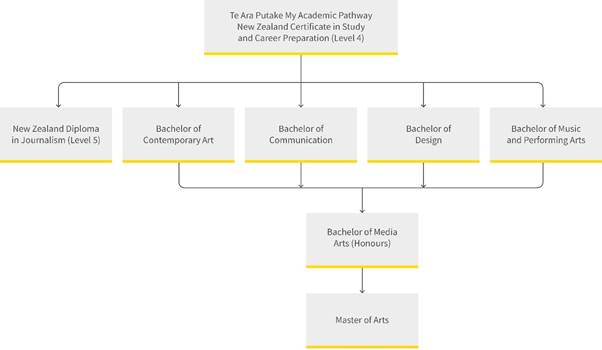 전공별로 학부예비과정이 따로 개설되며 학생들은 2개의 필수과목과 자신의 전공 공부에 필요한 2개 과목을 공부합니다. 여러 학부예비과정 중에서 예술학부 지망 학생들은 Creative Industries pathway를 수강하게 됩니다. 이 패스웨이는 디자인, 커뮤니케이션, 미술, 공연 및 음악 분야를 전공할 학생들에게 전공 공부에 필요한 기본 지식을 함양시키는데 초점을 두고 있습니다.
