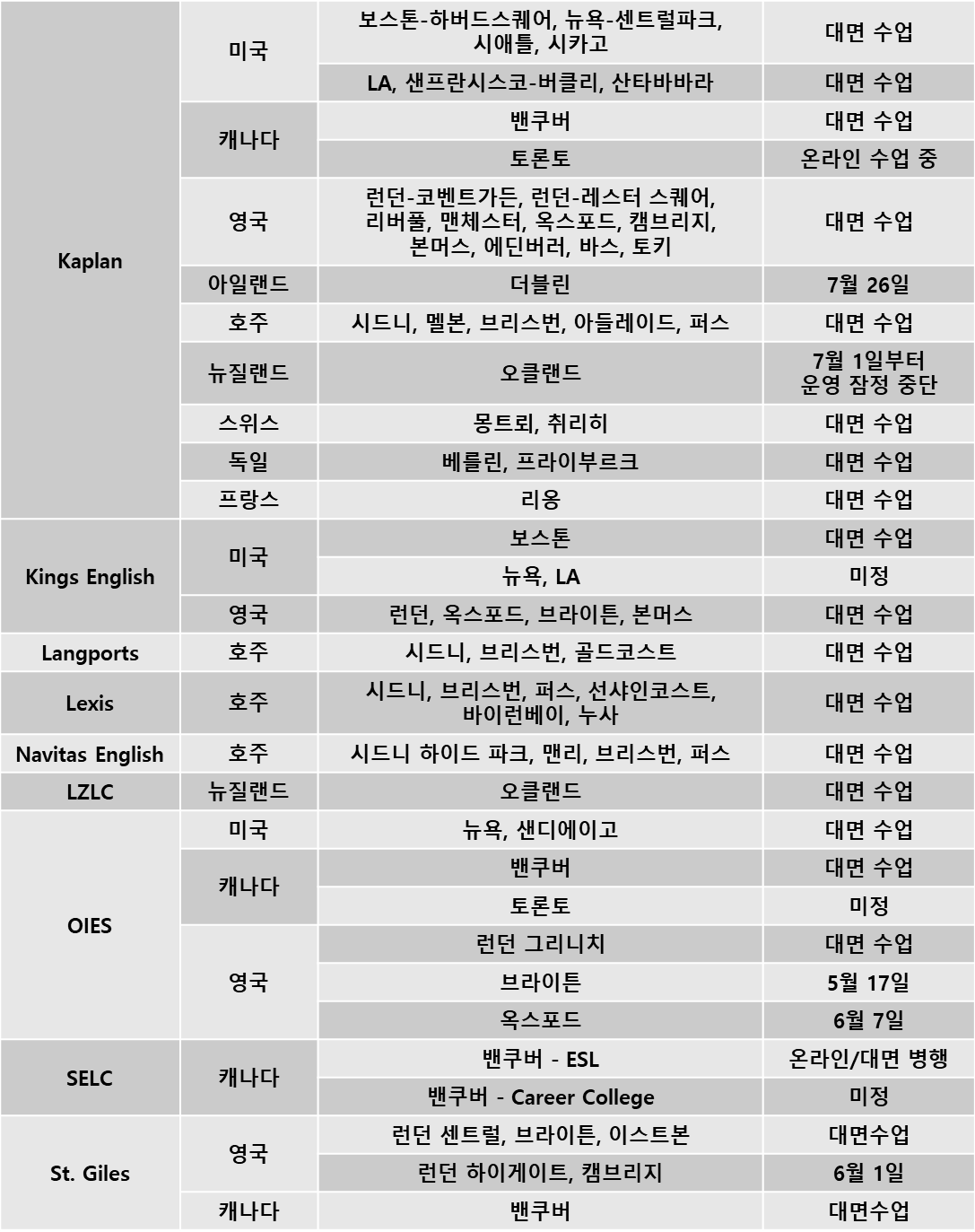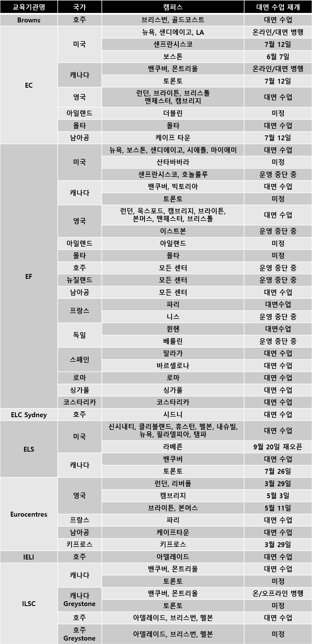 해외 교육기관 오프라인 면대면 수업 재개 일정 (2021. 7. 9 업데이트)